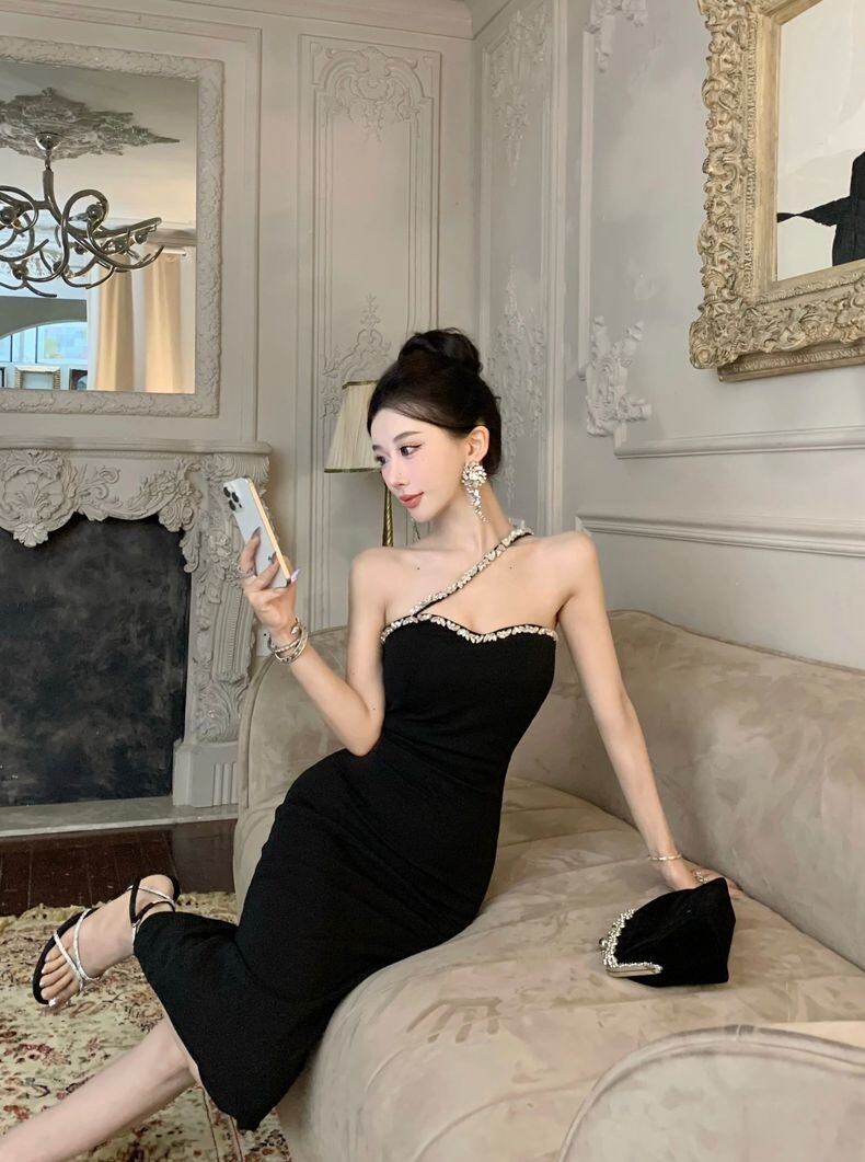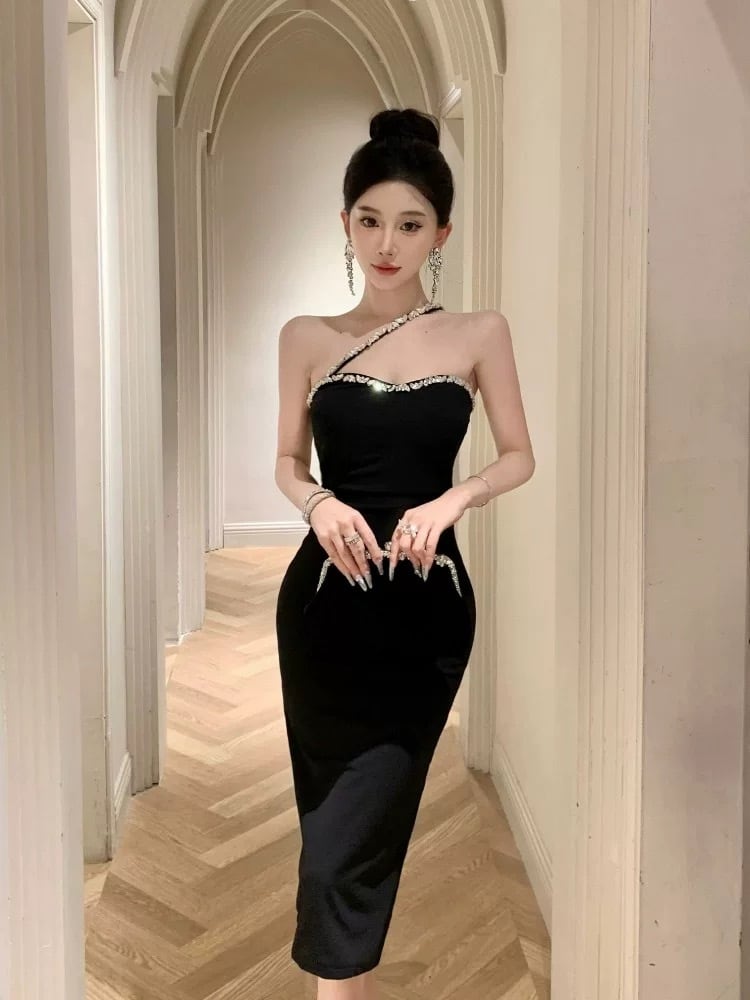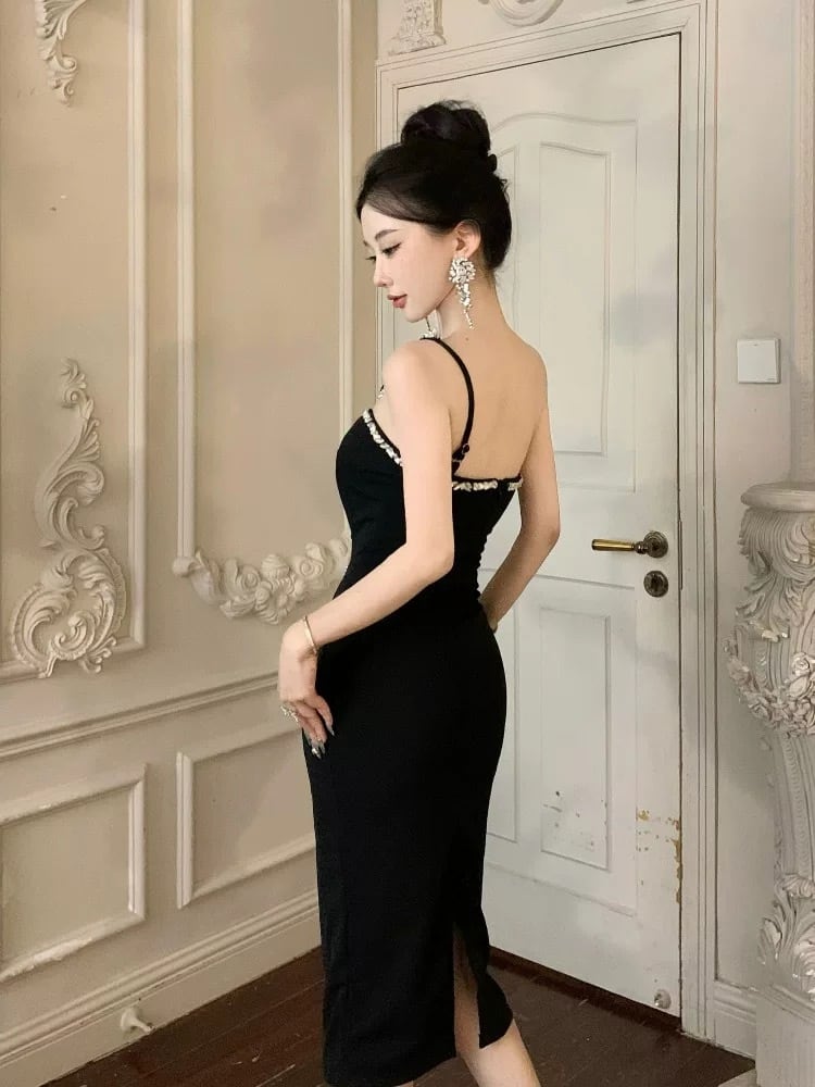 ビジュー付き 谷間見せ キャミソール タイトワンピース ミディ丈 キャバドレス